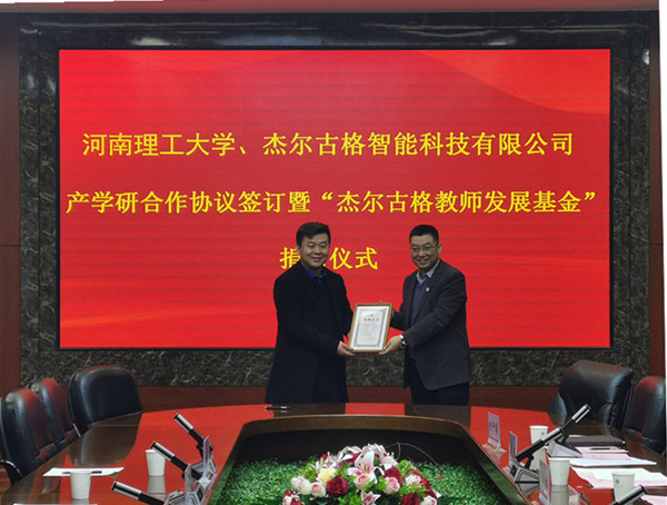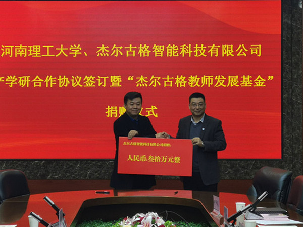 捐赠仪式上,聂凯、张琰瑞分别代表校企双方签订了产学研合作协议和30万元的“杰尔古格教师发展基金”捐赠协议;赵同谦代表校方接受杰尔古格智能科技有限公司的捐赠,并向该公司颁发捐赠证书。