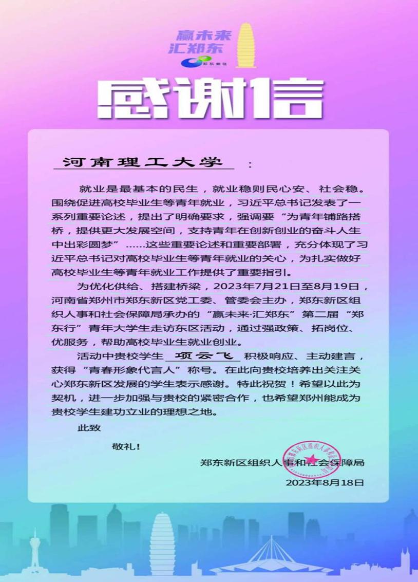 2022级学生项云飞在郑东新区发展中积极响应、主动建言的表现表示感谢。