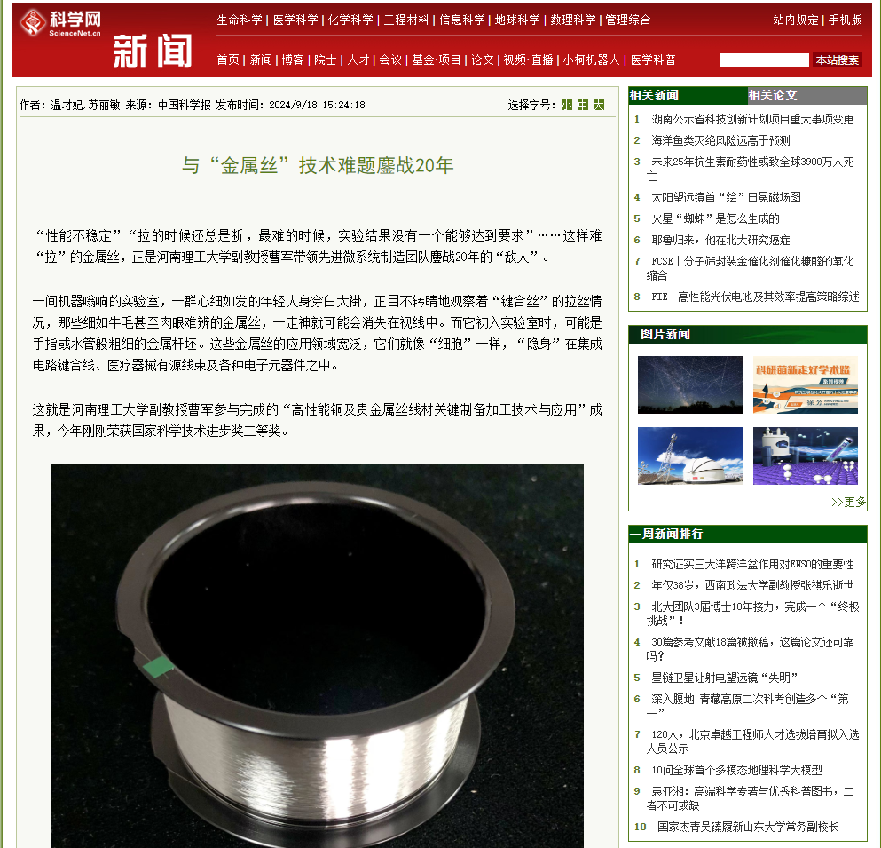 该团队研究的重点内容是将不同材质的金属杆坯不间断地拉成线直径10微米甚至更细、长度10万米甚至更长的金属丝。