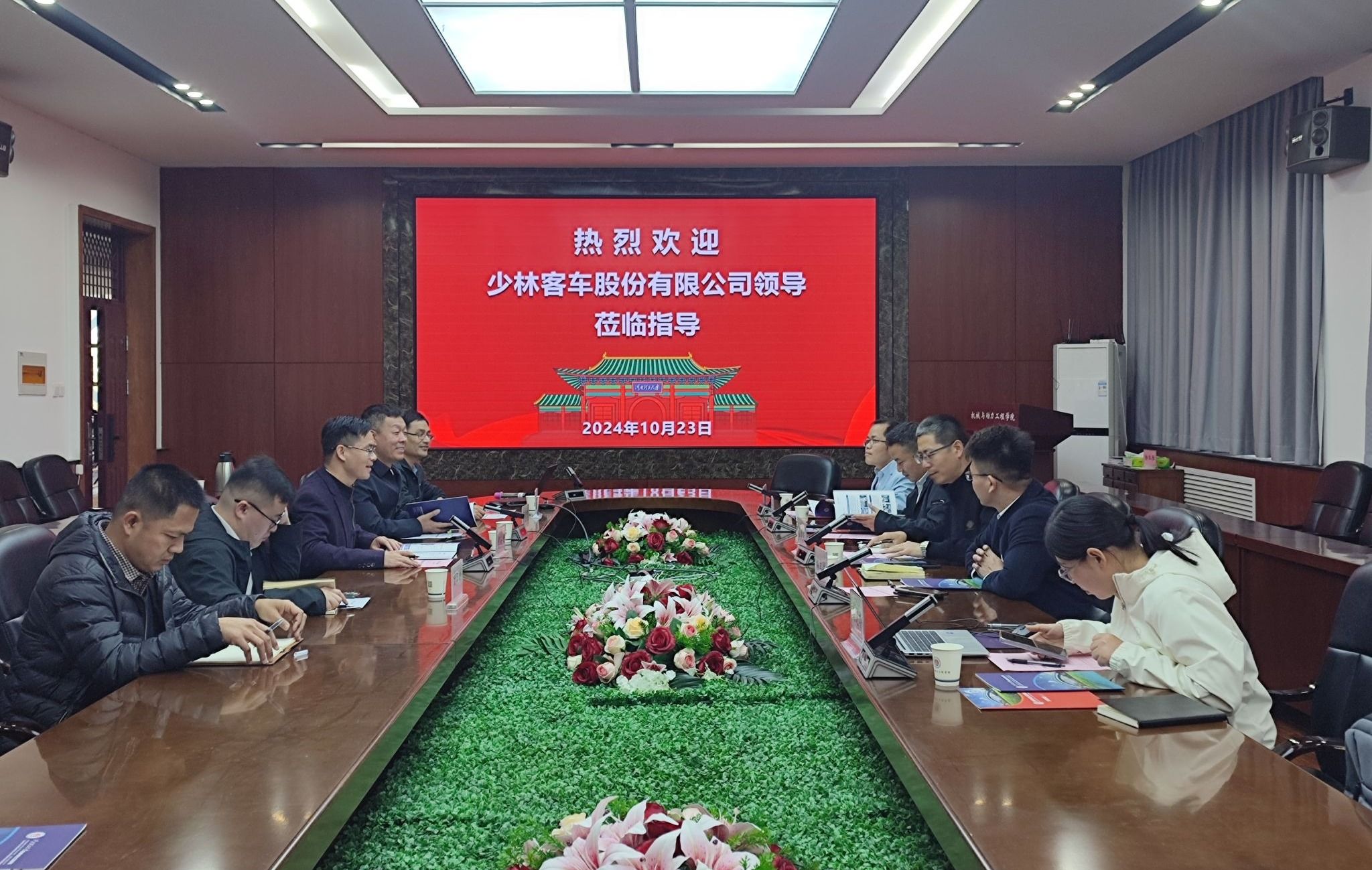 张安超代表学院对少林客车夏建华一行的到来表示热烈欢迎,详细介绍了学院人才培养、科研实力、成果转化等基本情况,希望能够与少林客车加强交流合作,共建学生实习实训基地、科研实践基地,提升人才培养质量以及学生就业质量,实现校企融合发展。并能在产教融合方面加强技术合作,利用学院的科研及人才资源助力企业技术创新与产品升级,实现优势互补,协同发展。