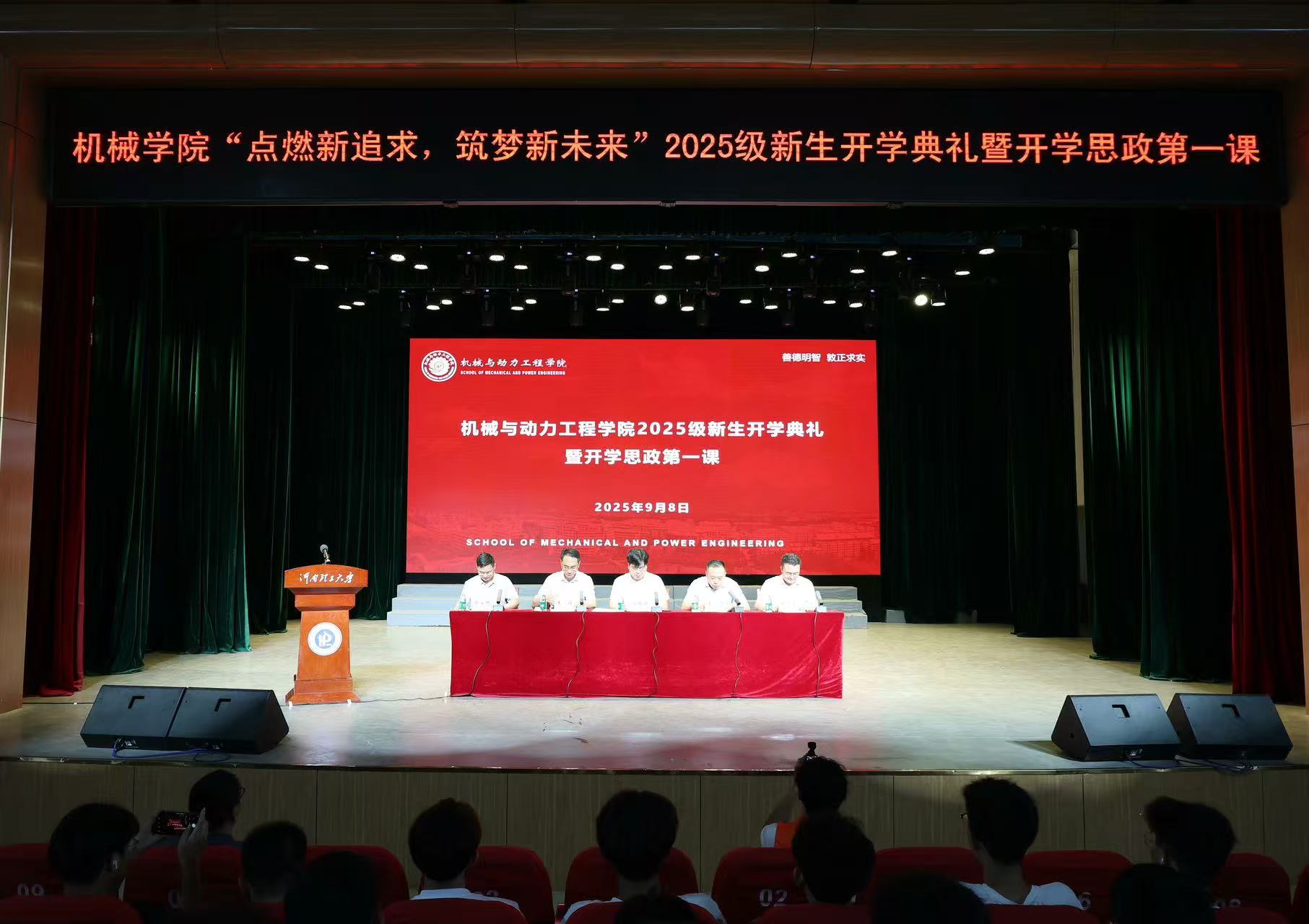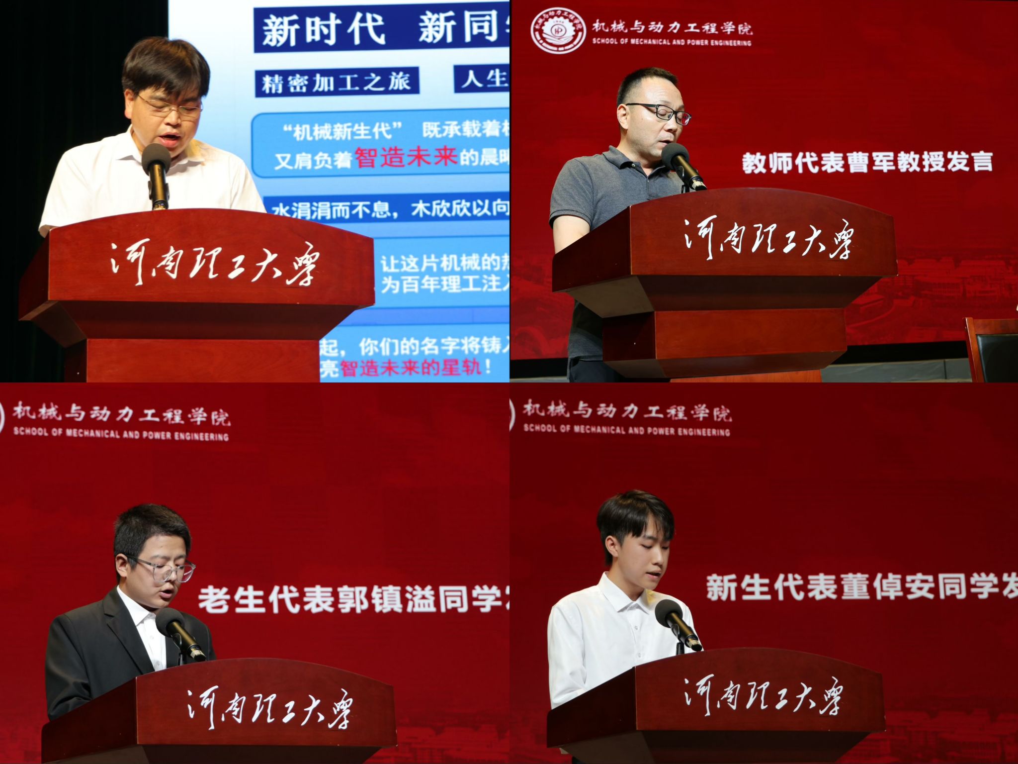 典礼在庄严的国歌声中拉开帷幕。教师代表曹军教授结合个人的求学与科研经历,向新生提出三点希望:一是培养“见微知著”的敏锐洞察力;二是保持“板凳要坐十年冷”的坚韧定力;三是树立“从实践中来,到实践中去”的科研态度。在校生代表郭镇溢同学从明确目标做好规划、勤奋学习注重实践、培养兴趣坚定信念四个方面,分享大学成长体会,鼓励新生珍惜时光,书写精彩的大学篇章。新生代表董倬安同学表达了对大学生活的美好憧憬,并代表全体新生郑重承诺:坚定理想信念,勇担时代使命;潜心专业学习,永葆求知热情;乐于互助奉献,珍视同窗情谊。院党委书记余本胜以“大学”为核心关键词,从认知、价值、实践三个层面,深入阐释了“什么是大学”“为什么上大学”“怎样上好大学”这三个根本问题。他从拓展知识广度、锤炼意志韧度、强化行动力度、积淀情感厚度、提升思想高度、提高做事效度六个方面,为新生送上详实的“成长指南”,鼓励大家以匠心筑梦、以奋斗启航。他特别寄语机械学子:应以“精工细作”的匠心打磨青春,以“知行合一”的实践丈量未来,在强国建设的征程上奋力跑出当代青年的最好成绩!