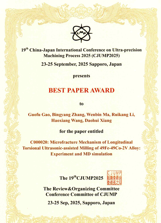 团队成员硕士生张丙洋(共同作者)参加了(视频)会议并作题为《Microfracture mechanism of longitudinal torsional ultrasonic- assisted milling of 49Fe-49Co-2V alloy: experiment and MD simulation》(Best Paper Award)的学术报告,详细介绍了超声辅助铣削技术的最新研究成果,对49Fe-49Co-2V等脆性合金微观断裂机理进行了深入探讨,对软磁合金高性能构件的工业应用具有重要意义。