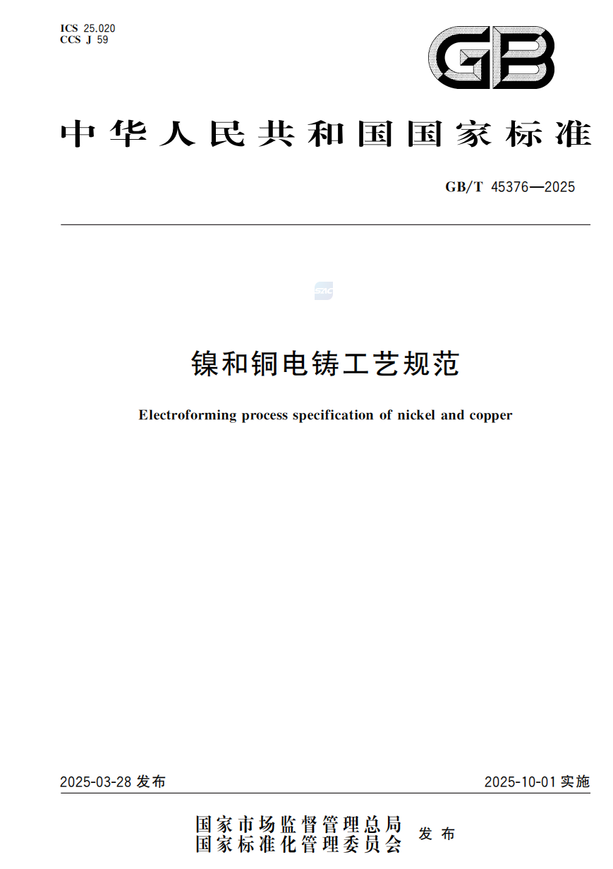 牵头组织中钞设计制版有限公司、苏州电加工机床研究所有限公司、南通美精微电子有限公司、南京航空航天大学、厦门市标准化研究院、西安交通大学等单位共同研制的GB/T 45376—2025《镍和铜电铸工艺规范》正式发布,并将于2025年10月1日起实施。该标准是我国电铸领域首个国家标准,其发布与实施填补了我国国家标准在该领域的空白,对推动我国电铸技术进步与产业规范化发展具有重要意义。