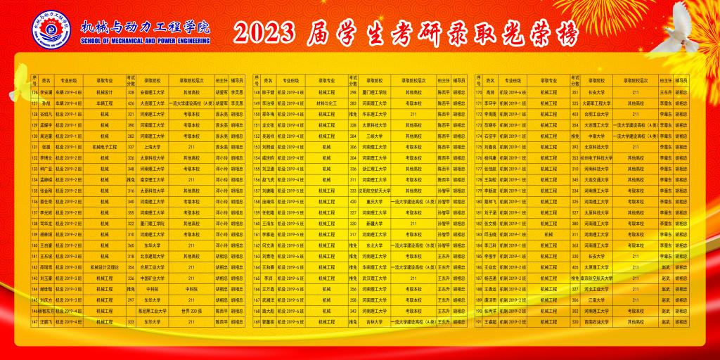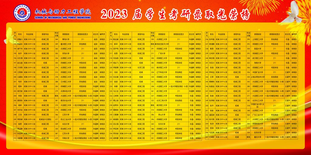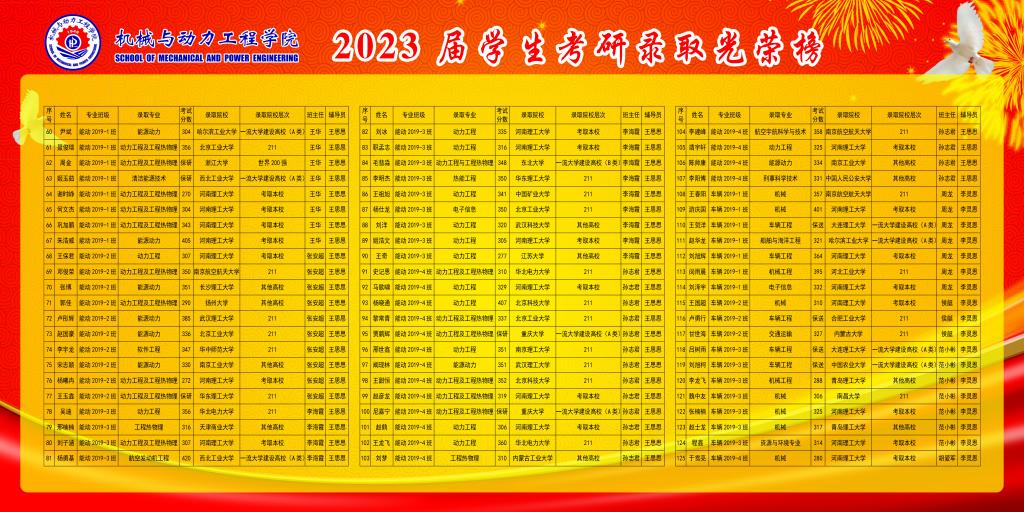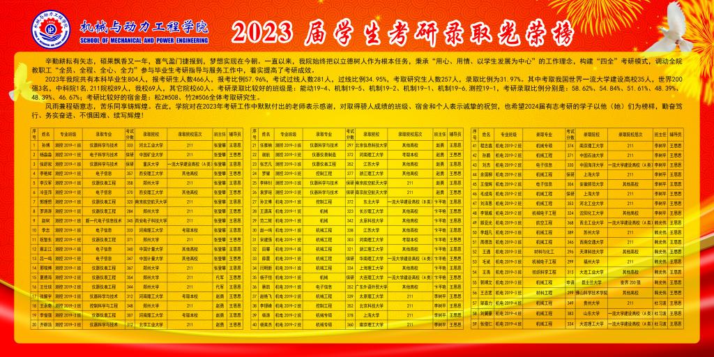共有本科毕业生804人,报考研生人数466人,报考比例57.96%,考试过线人数281人,过线比例34.95%,考取研究生人数257人,录取比例为31.97%。其中考取我国世界一流大学建设高校35人,世界200强3名,中科院1名,211院校89人,我校69人,其它院校60人。考研录取比较好的班级是:能动19-4、机制19-5、机制19-2、机制19-1、机制19-6,测控19-1,考研录取比例分别是:58.62%、54.84%、51.61%、48.39%、48.39%、46.67%;考研比较好的宿舍是:松2#508、竹2#506全体考取研究生。