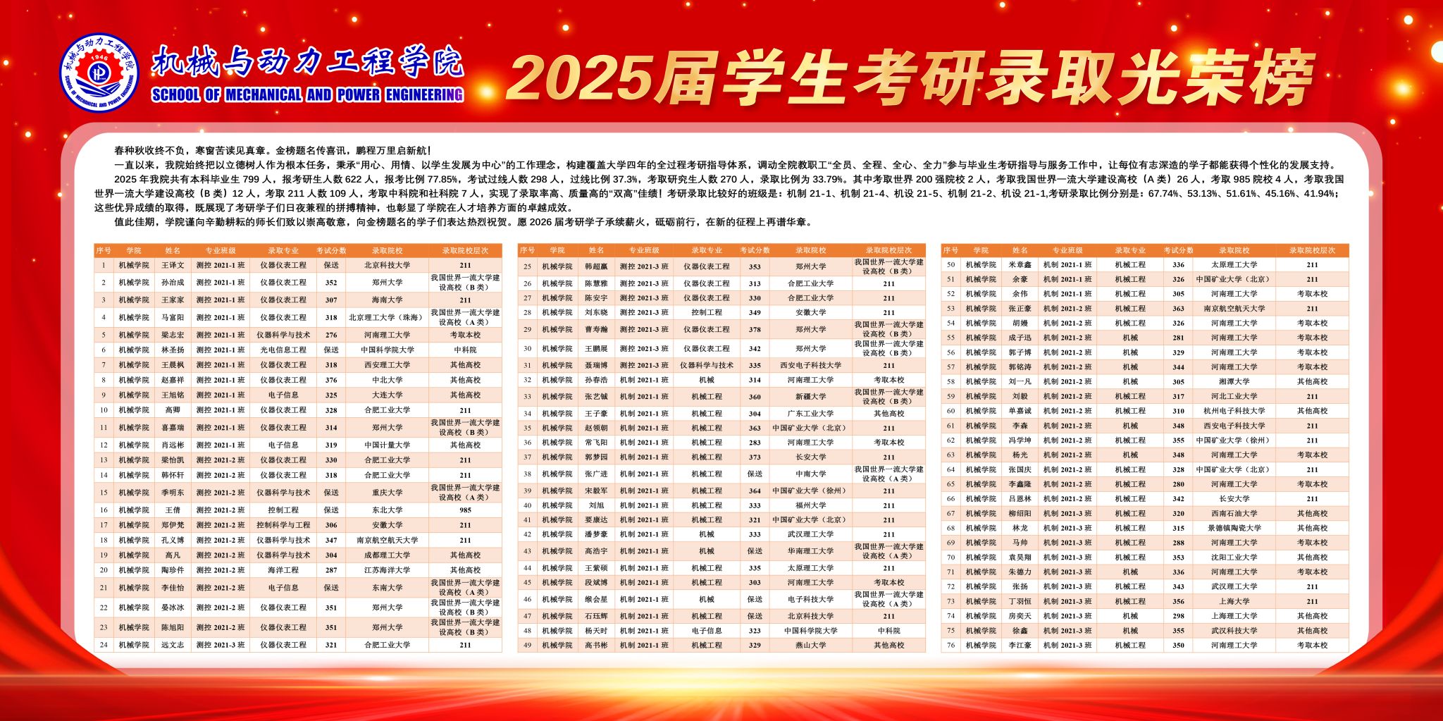 共有本科毕业生799人,报考研生人数622人,报考比例77.85%,考试过线人数298人,过线比例37.3%,考取研究生人数270人,录取比例为33.79%。其中考取世界200强院校2人,考取我国世界一流大学建设高校(A类)26人,考取985院校4人,考取我国世界一流大学建设高校(B类)12人,考取211人数109人,考取中国科学院和中国社会科学院7人,实现了录取率高、质量高的“双高”佳绩!考研录取比较好的班级是:机制21-1、机制21-4、机设21-5、机制21-2、机设21-1,考研录取比例分别是:67.74%、53.13%、51.61%、45.16%、41.94%;这些优异成绩的取得,既展现了考研学子们日夜兼程的拼搏精神,也彰显了学院在人才培养方面的卓越成效。