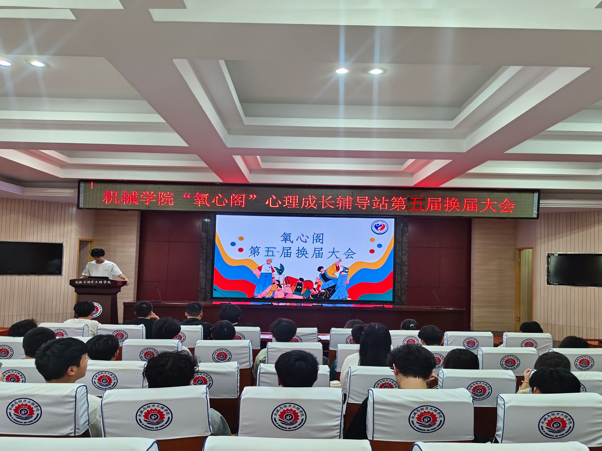 心理健康教育工作贡献更多力量。随后,教导部部长胡博涵通过详实的数据和丰富的案例,全面回顾了任期内团队的成长历程与工作成果,并分享了在组织管理、活动策划过程中的经验与感悟。他表示,“氧心阁”成长辅导站不仅是一个工作团队,更是一个充满爱与温暖的大家庭,感谢每一位成员的辛勤付出与相互支持,希望新一届成员能够不忘初心,砥砺前行。在换届环节,在前期递交申请表的基础上,各岗位候选人依次上台进行竞选演讲,他们围绕个人优势、对岗位的理解以及未来工作规划等方面展开阐述,言辞恳切、激情满怀,充分展现出对辅导站工作的热情与责任感。